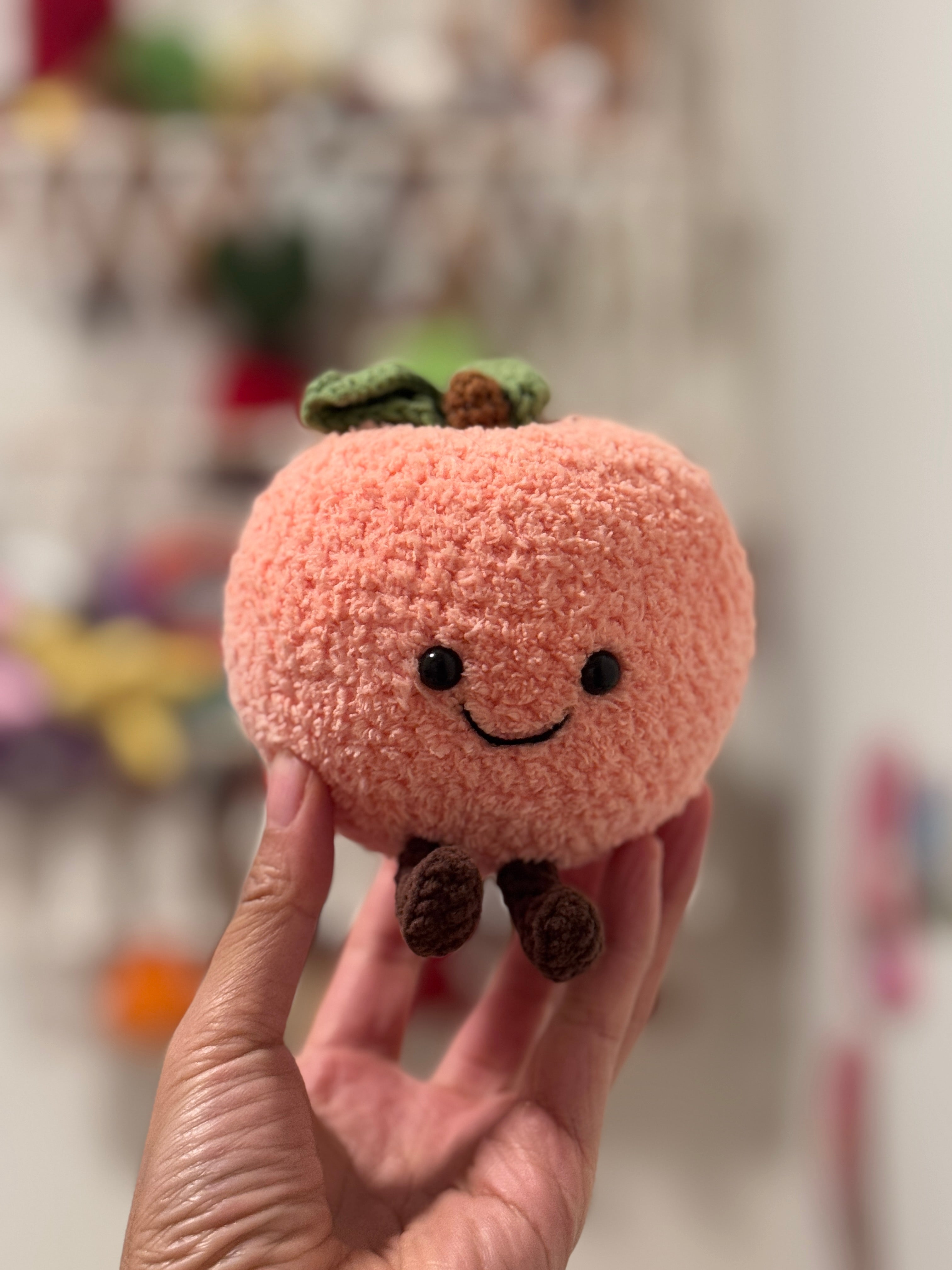 Meet your new squishy little desk companion—a soft, round peach with tiny legs, leafy topper, and an optional sweet smile. This plush amigurumi works up quickly and is wonderfully giftable, whether you’re making a cute charm, a shelf buddy, or a playful seasonal décor piece.